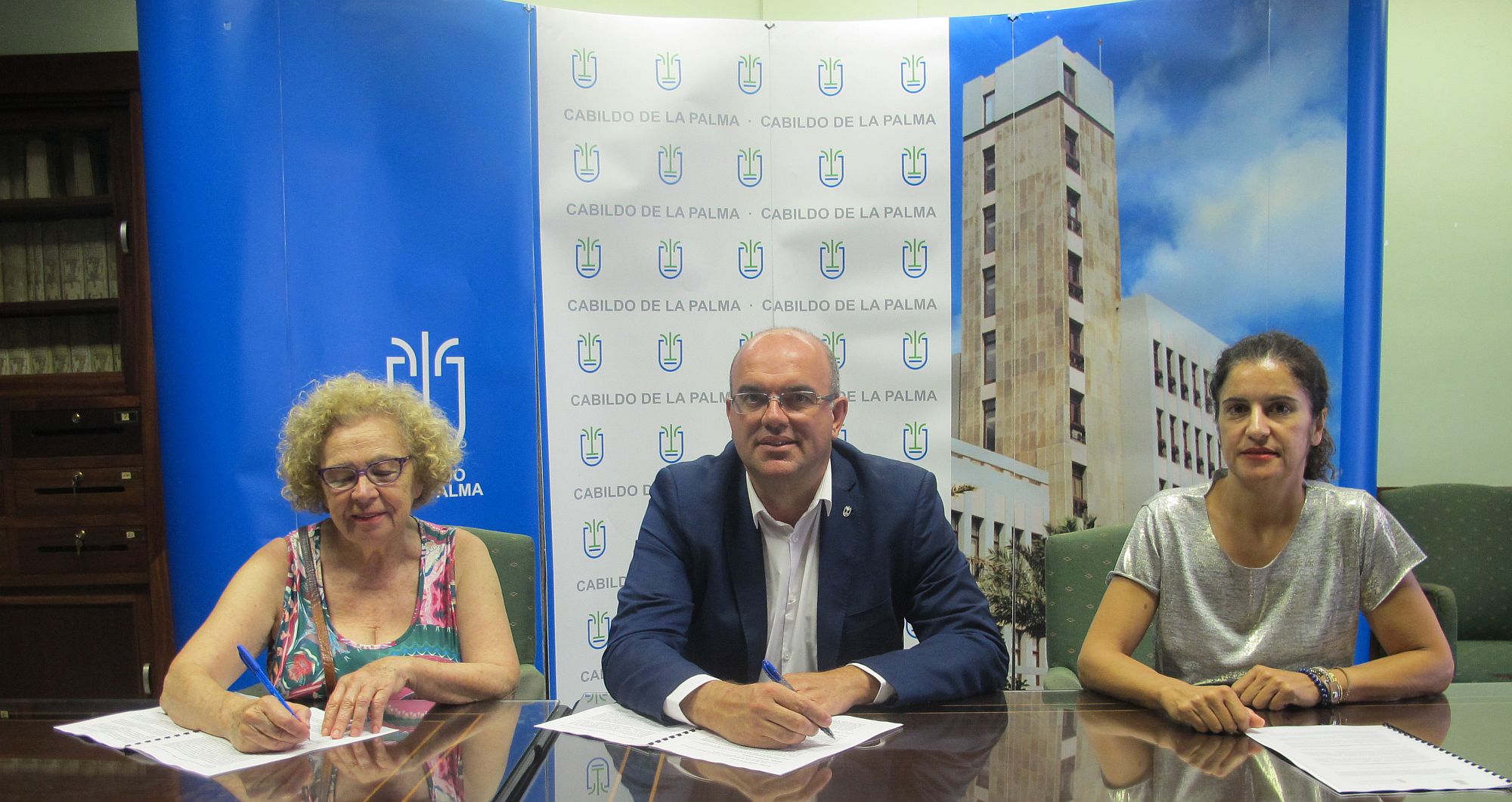 El presidente del Cabildo Insular de La Palma, Anselmo Pestana, acompañado por la consejera de Asuntos Sociales, Jovita Monterrey, y la presidenta de la Fundación Canarias Solidaridad, Carmen Hernández, han puesto su rúbrica en el documento que prevé esta acción coordinada y la aportación económica de la institución insular.