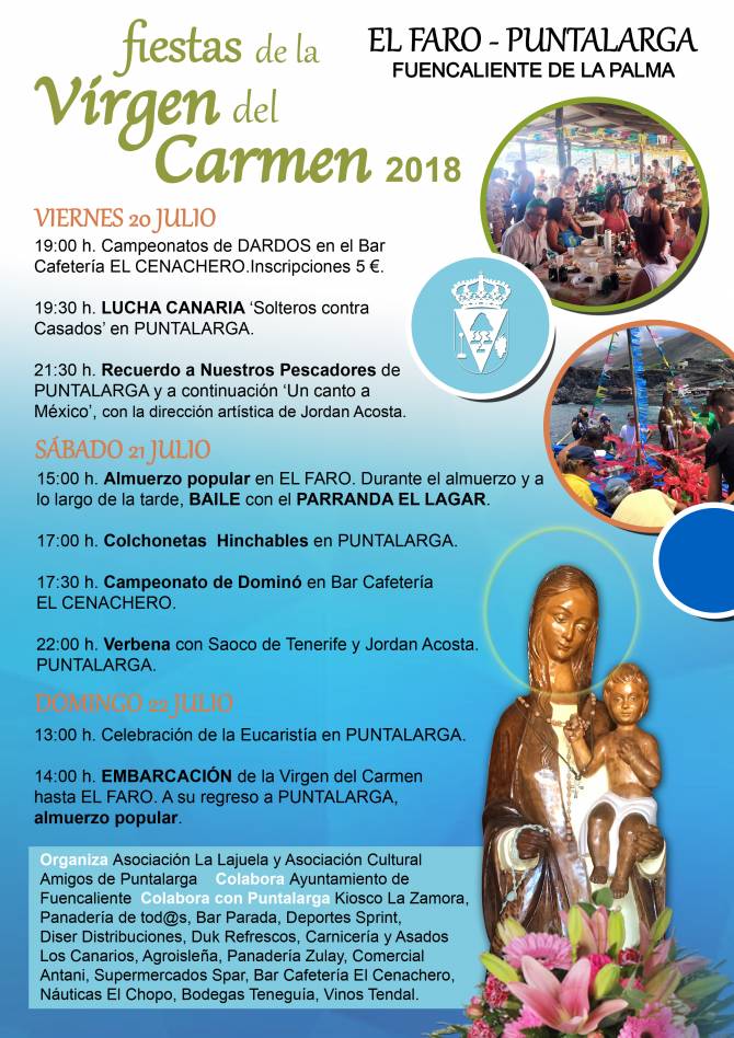 El municipio de Fuencaliente celebra este fin de semana la festividad en honor a la Virgen del Carmen en los núcleos pesqueros de El Faro y Puntalarga. “Se trata de una celebración organizada por los propios vecinos y vecinas a través de las distintas asociaciones, y en la que colabora el Ayuntamiento de Fuencaliente”, explica la alcaldesa y concejal de Fiestas, Nieves María Rodríguez.