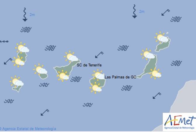 Viento del nordeste moderado, con intervalos de fuerte en extremos noroeste y sudeste al inicio, siendo de componente norte flojo en medianías y zonas altas.