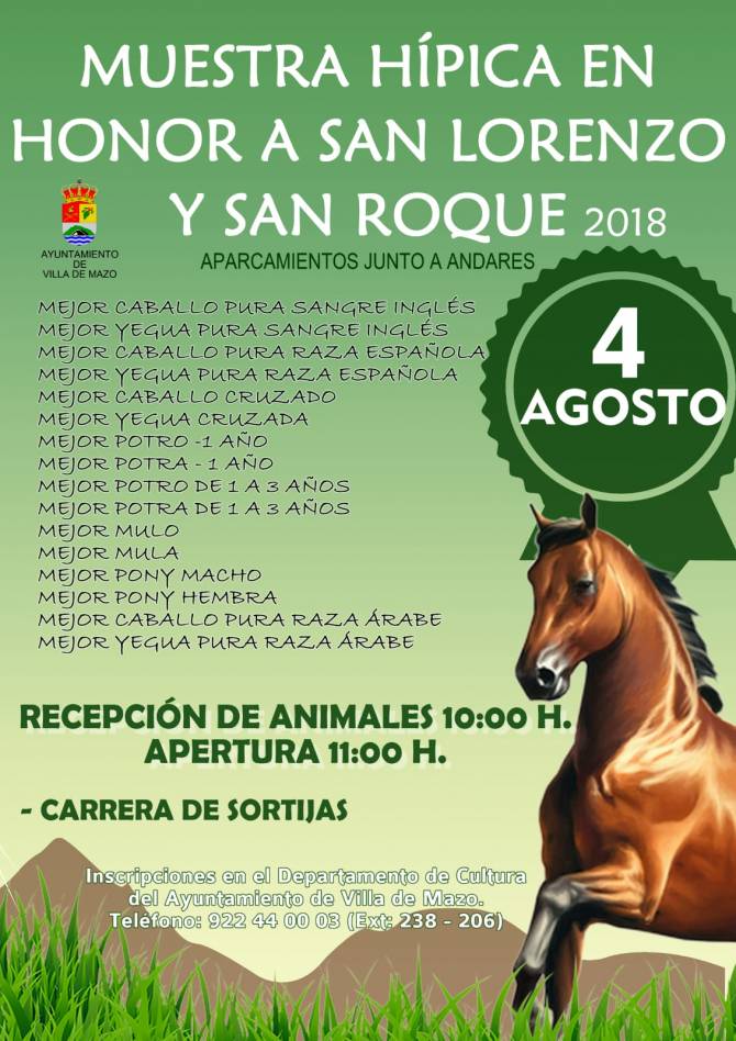 El Ayuntamiento de Villa de Mazo, en colaboración con el Cabildo de La Palma y la Sociedad de Promoción y Desarrollo de la isla de La Palma (Sodepal), organiza una muestra hípica en honor a San Lorenzo, copatrón del municipio, y San Roque, que tendrá lugar el sábado 4 de agosto, a partir de las 11:00 horas.