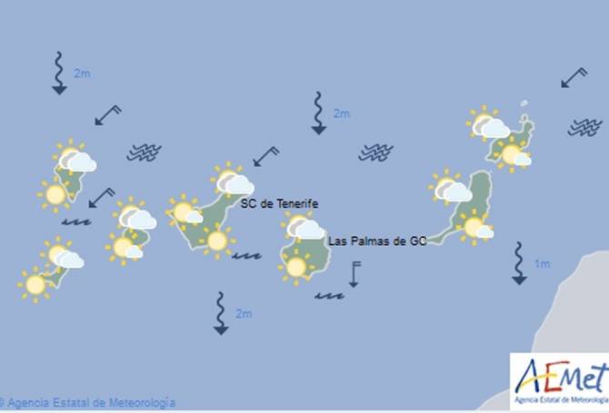 Viento del nordeste moderado, con intervalos de fuerte en vertientes sureste y noroeste. En medianías y zonas altas, viento del nordeste moderado, con intervalos de fuerte a primeras horas. Brisas en costas suroeste.