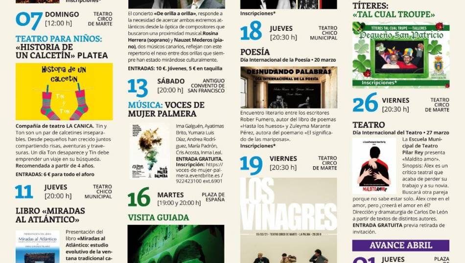 El Ayuntamiento de Santa Cruz de La Palma, a través de la Concejalía de Cultura, ha organizado más de una docena de actividades culturales, festivas y de ocio para el mes de marzo, que arranca hoy viernes con la programación de una visita guiada al Teatro Circo de Marte, organizada por la Concejalía de Patrimonio Cultural. Dicha actividad se desarrolla con motivo del 150 aniversario del centro cultural, al que se podrá acceder en tres pases, a las 19:00, 20:00 y 21.00 horas. La...