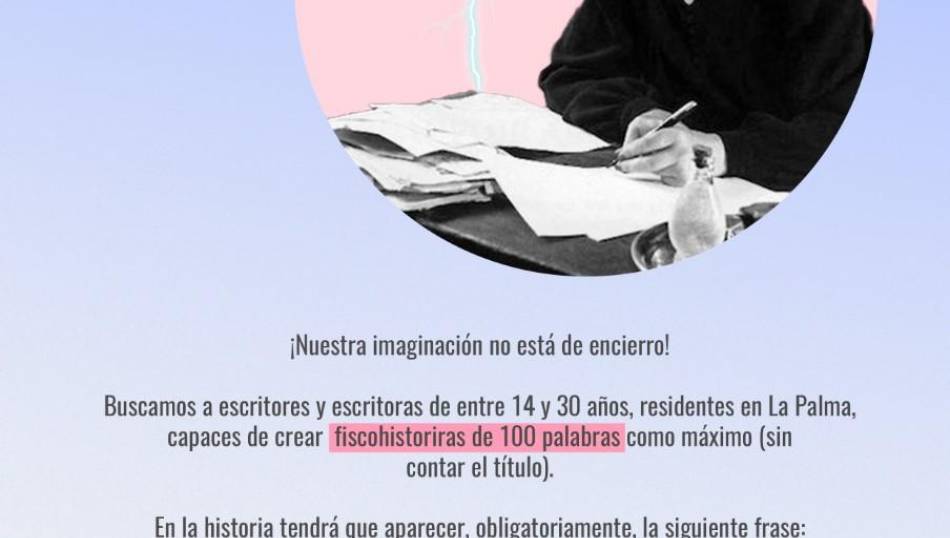 La Concejalía de Juventud del Ayuntamiento de Santa Cruz de La Palma ha organizado un concurso literario de ‘fiscohistorias”, relatos cortos de hasta 100 palabras con los que se pretende que los jóvenes de la Isla mantengan despierta su capacidad imaginativa durante el confinamiento por el Covid-19. La concejala del área, Virginia Espinosa, ha destacado “la necesidad de aportar desde las instituciones públicas las herramientas para que nuestros jóvenes alimenten su creatividad...