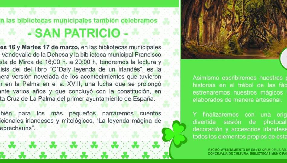 Las bibliotecas municipales Luis Vandevalle de La Dehesa y Francisco Acosta de Mirca celebrarán los días 16 y 17 de este mes la fiesta de San Patricio. Ambos centros han organizado una lectura y análisis del libro ‘O’Daly, leyenda de un irlandés’, la primera versión novelada de los acontecimientos que tuvieron lugar en La Palma en el siglo XVIII, una lucha que se prolongó durante varios años y que concluyó con la constitución del primer ayuntamiento de España en Santa Cruz de La ...