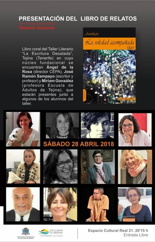 Los escritores, alumnos y profesores del taller literario La Escritura desatada de Tejina (Tenerife) presentan su libro de relatos La soledad acompañada, fruto de más de tres años de esfuerzo y aprendizaje creativo recíproco, en el Espacio Cultural Real 21, el próximo sábado, 28 de abril, a las 20.15 horas. La escritora grancanaria Rosario Valcárcel, con fuertes vínculos en nuestro municipio, será la encargada de presentar literaria y personalmente a los autores que visitan el...